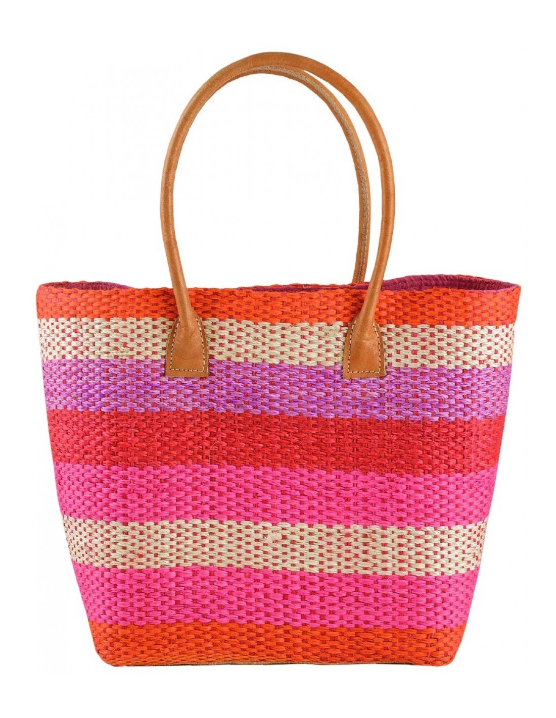Χειροποίητη πλεκτή τσάντα Sisal με rafia πομ πομς, με επένδυση ψάθας και δερμάτινα χερούλια.
