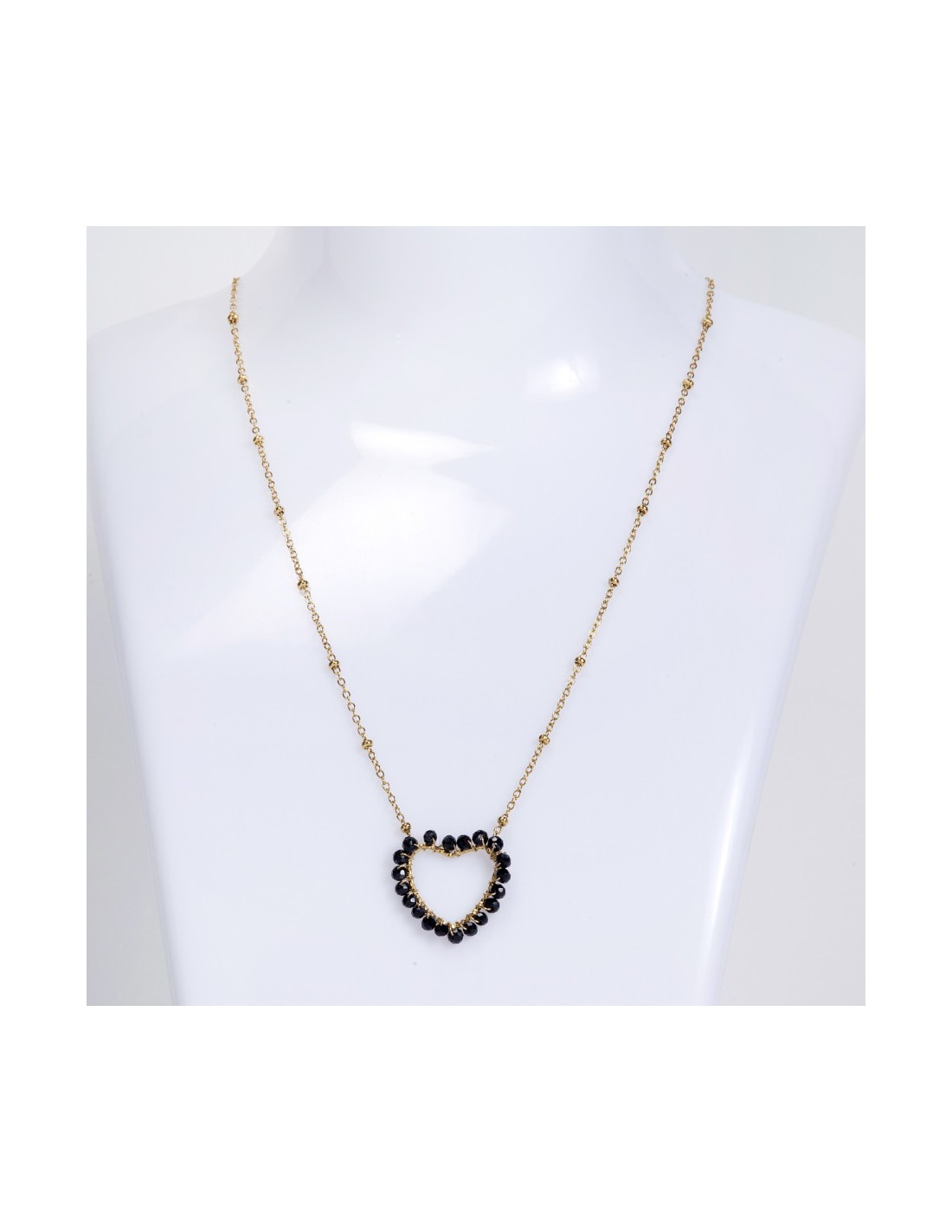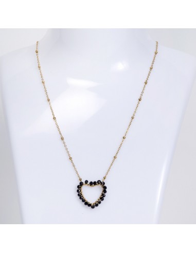 Αυτό το ατσάλινο κολιέ σε χρυσή απόχρωση διαθέτει ένα εκλεπτυσμένο κρεμαστό σε σχήμα καρδιάς, διακοσμημένο με μαύρες χάντρες για μια πινελιά κομψότητας και ρομαντισμού.
