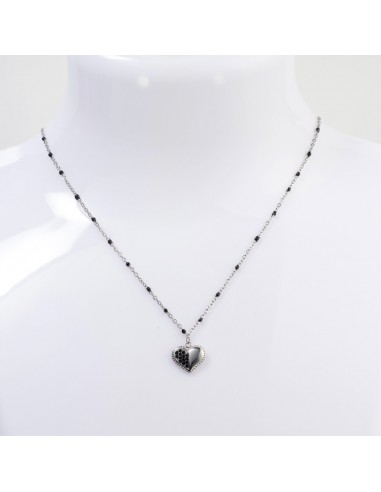 Αυτό το ατσάλινο κολιέ σε ασημένια απόχρωση διαθέτει ένα κομψό μενταγιόν σε σχήμα καρδιάς, διακοσμημένο με μαύρες λεπτομέρειες και κομψή αλυσίδα με μαύρες χάντρες. Ιδανικό για να προσθέσει μια μοντέρνα και ρομαντική πινελιά στο στυλ σας.